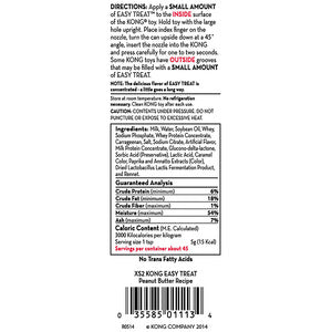 La crema sabor mantequilla de maní Easy Treat de KONG es un bocado delicioso que deleita a todo tipo de perros y ofreciendo al mismo tiempo una solución fácil y sencilla. Este bocado de muy fácil digestión y libre de grasas trans es un acompañamiento delicioso y tentador cuando se agrega para rellenar un Kong. Su boquilla con un diseño único permite controlar fácilmente la cantidad de producto a la vez que ofrece el beneficio agregado de una solución de rellenada cómoda y sin desastres.