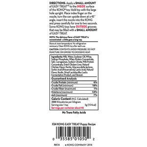 La crema Puppy Easy Treat de KONG tiene una fórmula única para satisfacer las necesidades de los cachorros. La receta de hígado de pollo con seguridad será una tentación que atraerá a los cachorros que recién comienzan o están en su etapa de dentición ofreciendo una solución fácil y sencilla para premiarlos sin ensuciarte. Es un acompañamiento delicioso y tentador cuando se agrega a un Panal clásico de Kong para cachorro. Su boquilla con un diseño único permite controlar fácilmente la cantidad de producto a la vez que ofrece el beneficio agregado de una solución de rellenado cómoda sin ensuciar.