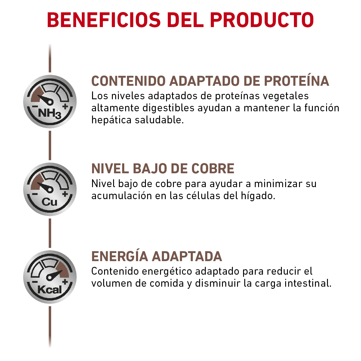 - Bajo en Cobre: Contenido reducido de cobre para minimizar su acumulación en el hígado.