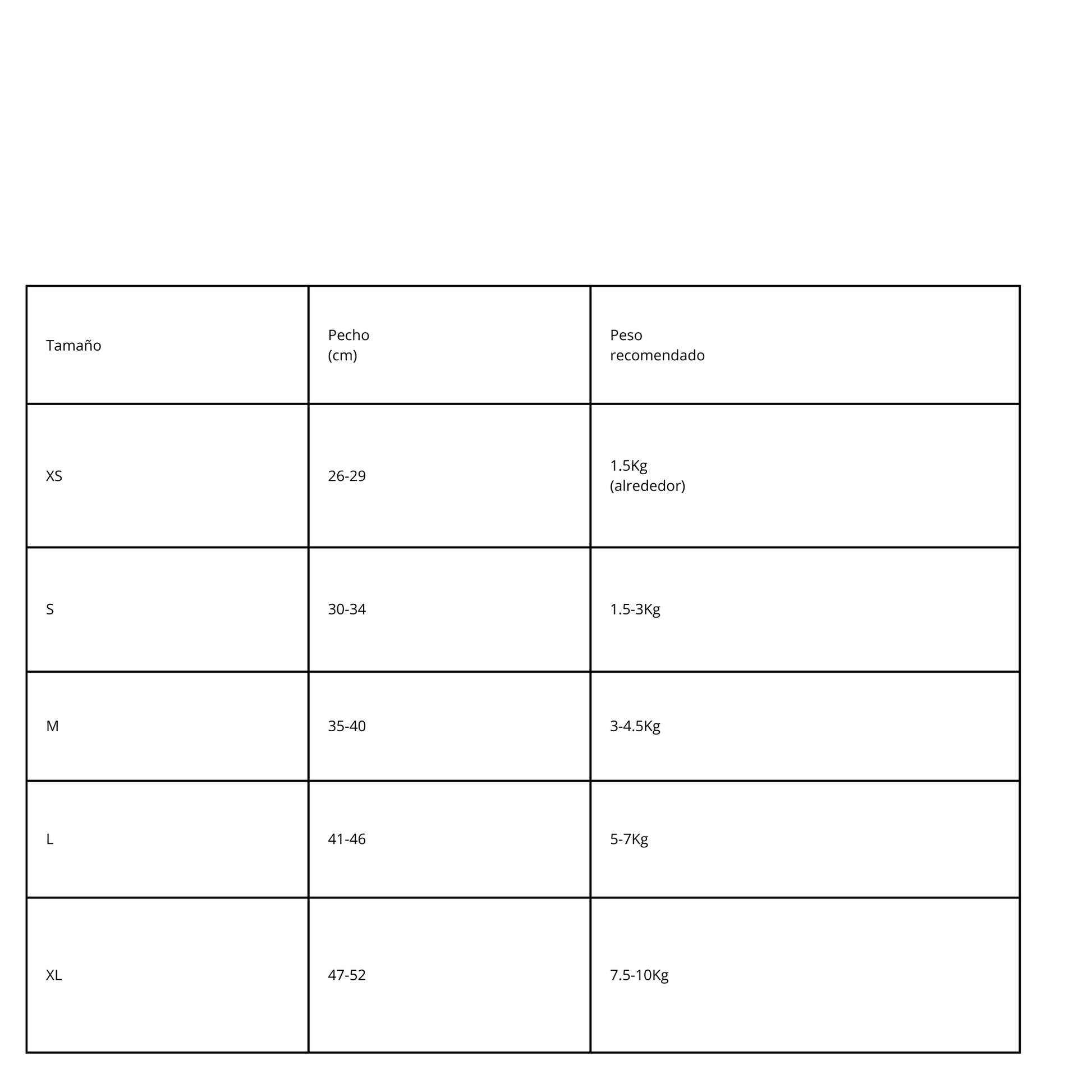 Circunferencia de pecho (Aprox.): XCH: 26cm; CH: 36cm; M: 40cm; G: 46cm; XG: 55cm